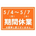 2025年4月7日 / 最終更新日時 : 2025年6月30日 yukie 休業日 GW(ゴールデンウイーク)休業のお知らせ 5月5日(月曜日)から5月8日(木曜日)の4日間休業させて頂きます ご迷惑をおかけしますが、よろしくお願い申し上げます。